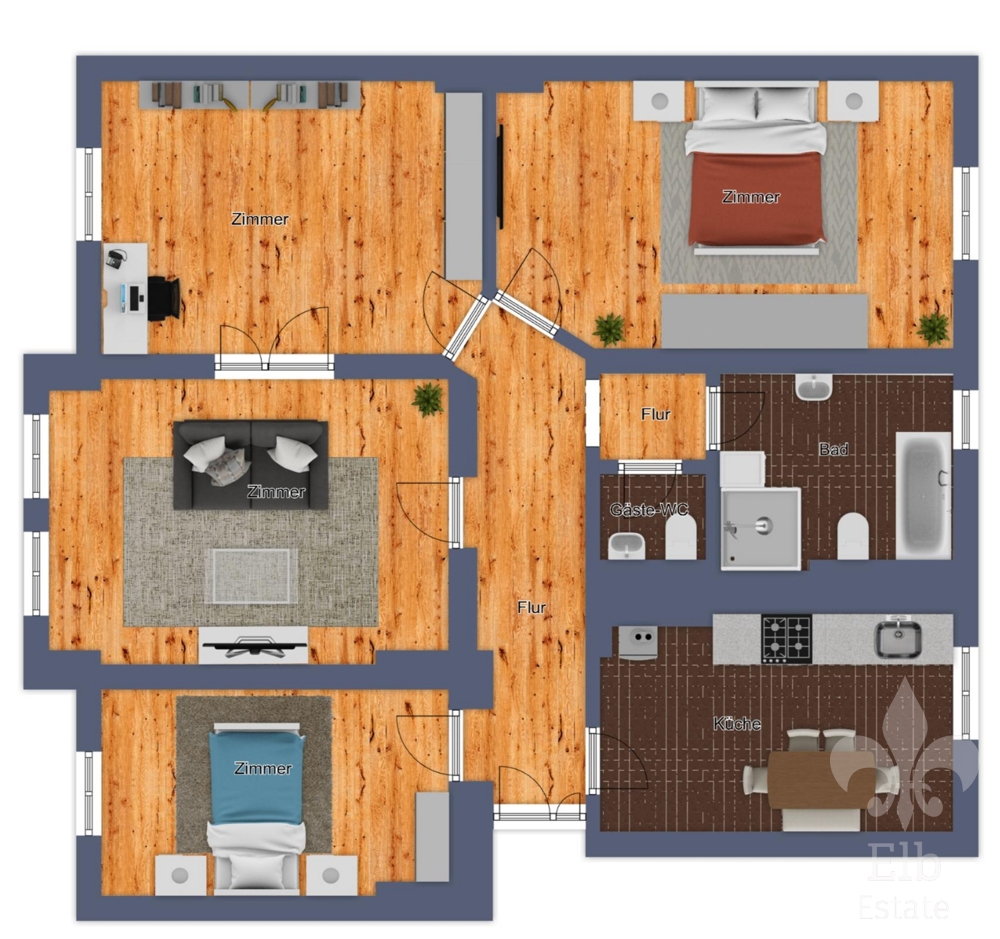 - stilvoller Dielenboden in den Wohnräumen und im Flur sorgt für eine warme, behagliche Wohnatmosphäre